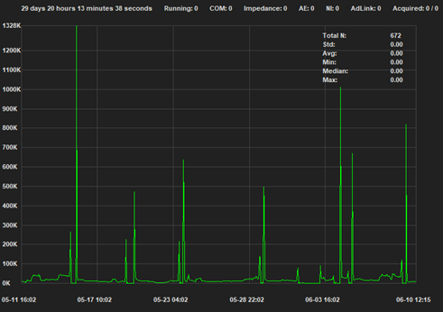 Kuva 2. Esimerkki akustisen emission mittauksesta ajan funktiona. Muutokset prosessissa näkyvät piikkeinä jatkuvassa mittausdatassa.