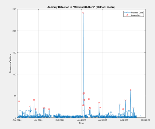 Kumivuorauksen irtoamistapauksia havaittiin 02.08.2024, 17.02.2025 ja 22.08.2025. Selviä poikkeamia oli nähtävissä myös ennen helmikuun 2025 tapausta, erityisesti tammikuussa 2025 (Kuva 3), mikä viittaa ennakoivan tunnistamisen mahdollisuuteen.